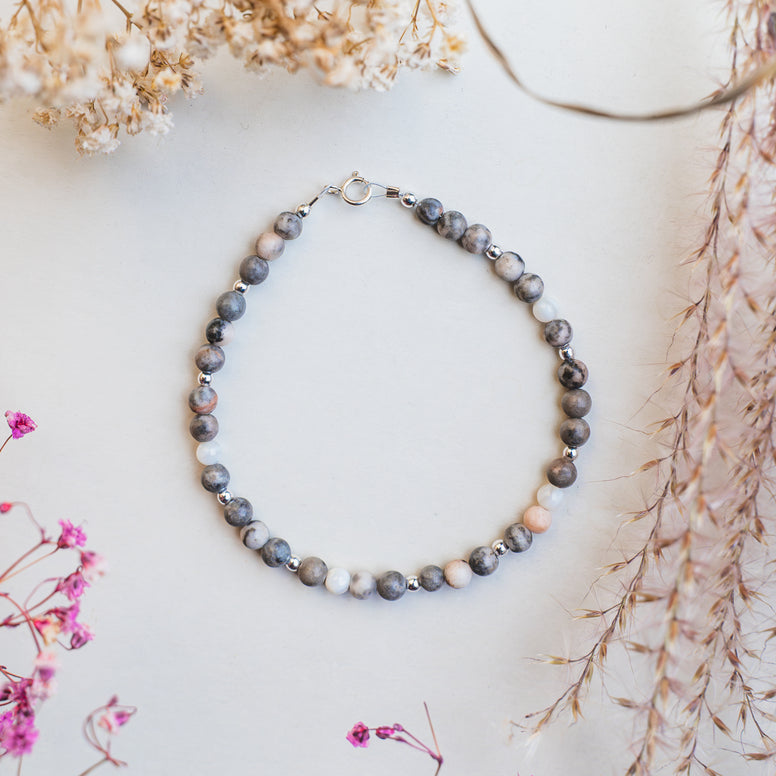 Bransoletka „Ternura” (z hiszpańskiego: czułość) została wykonana z jaspisu w kolorach szarości, bieli i różu z dodatkiem masy perłowej oraz srebrnego hematytu. Łagodne barwy kamieni nadają jej delikatny, kobiecy charakter. Idealny na co dzień – jako talizman ciepła i dobrej energii.