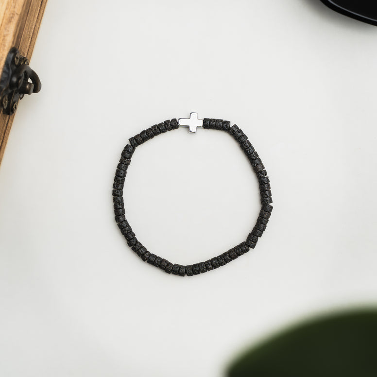 Bransoletka „Santiagozostała wykonana z krążków lawy wulkanicznej. Surowa i matowa struktura kamieni nadaje bransoletce minimalistyczny oraz elegancki wygląd. Delikatnego blasku dodaje bransoletce krzyż z hematytu w kolorze srebrnym.