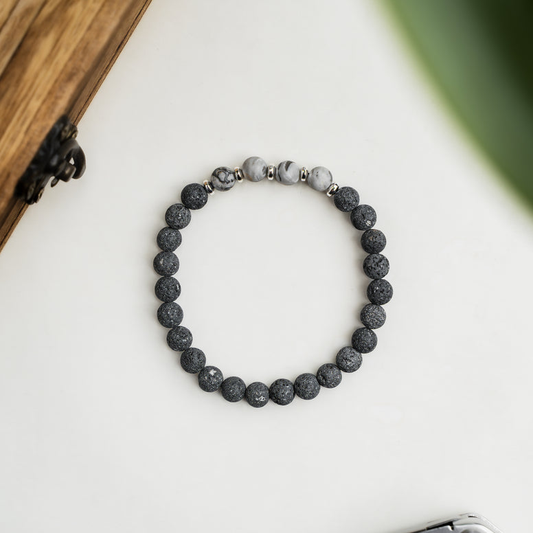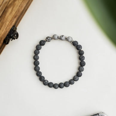 Bransoletka „Vigo” została wykonana z grafitowej lawy wulkanicznej oraz matowych kamieni jaspisu szarego, przekładanych hematytem w kolorze srebrnym.