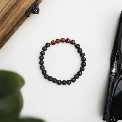 Bransoletka „Teide” została wykonana z czarnej lawy wulkanicznej oraz brązowego obsydianu w matowym wykończeniu. Subtelnego blasku dodaje hematyt w kolorze złota.