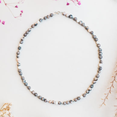 Naszyjnik „Ternura” (z hiszpańskiego: czułość) został wykonany z jaspisu w kolorach szarości, bieli i różu z dodatkiem masy perłowej oraz srebrnego hematytu. Łagodne barwy kamieni nadają mu delikatny, kobiecy charakter. Idealny na co dzień – jako talizman ciepła i dobrej energii.