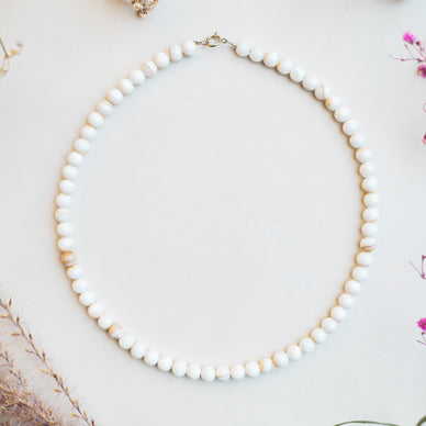 Naszyjnik „Pureza” (z hiszpańskiego: czystość) został wykonany z dużych, gładkich kulek masy perłowej. Delikatny, klasyczny i ponadczasowy – pasuje do każdej stylizacji.