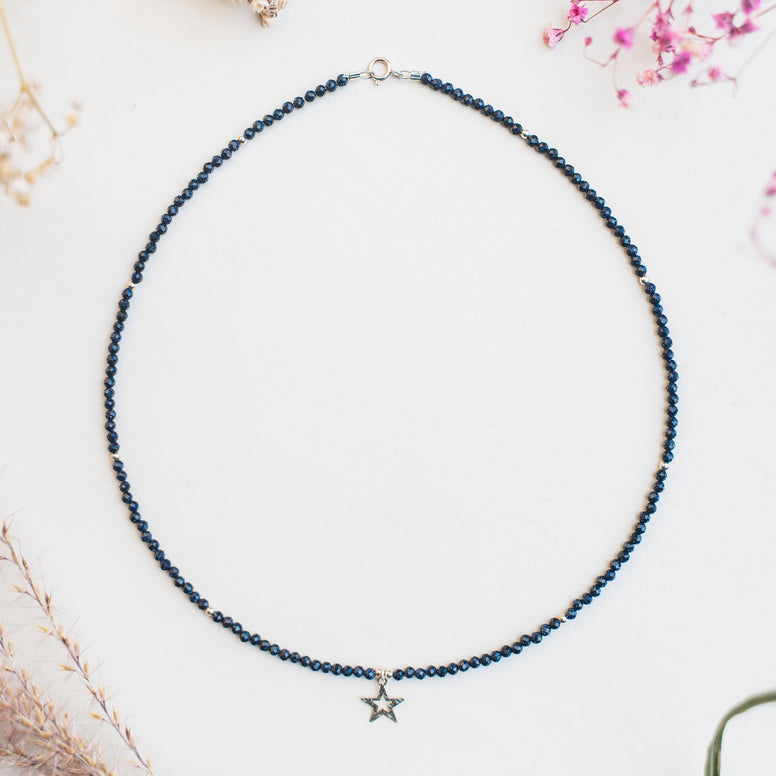 Naszyjnik „Misterio” (z hiszpańskiego: tajemnica) hipnotyzuje głębią granatu i blaskiem srebra. Jak rozgwieżdżone niebo – przyciąga wzrok i budzi ciekawość. Idealny dla kobiet, które cenią elegancję z nutą tajemniczości. Drobna przywieszka w kształcie gwiazdki dodaje mu niebiańskiego charakteru.