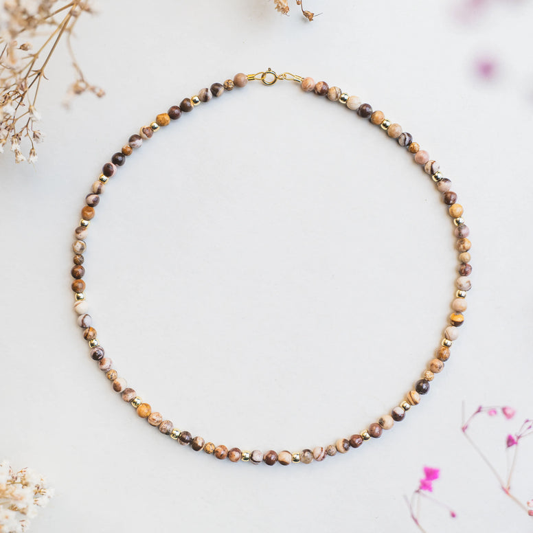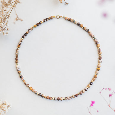 Naszyjnik „Estabilidad” (z hiszpańskiego: stabilność) został wykonany z jaspisu w odcieniach brązu i beżu oraz hematytu w kolorze light gold. Prosty, ciepły i elegancki – dla kobiet, które cenią spokój i poczucie bezpieczeństwa.